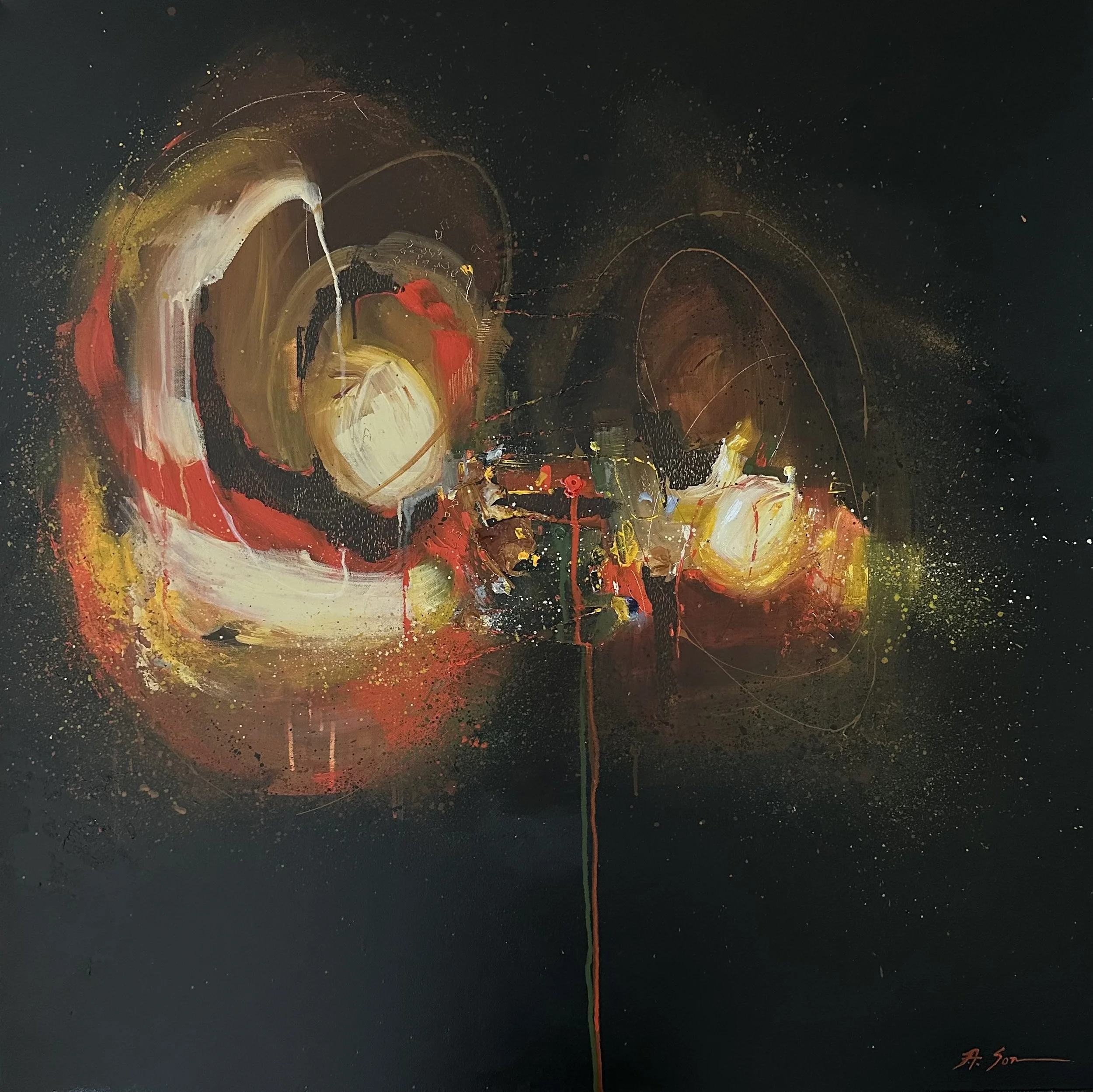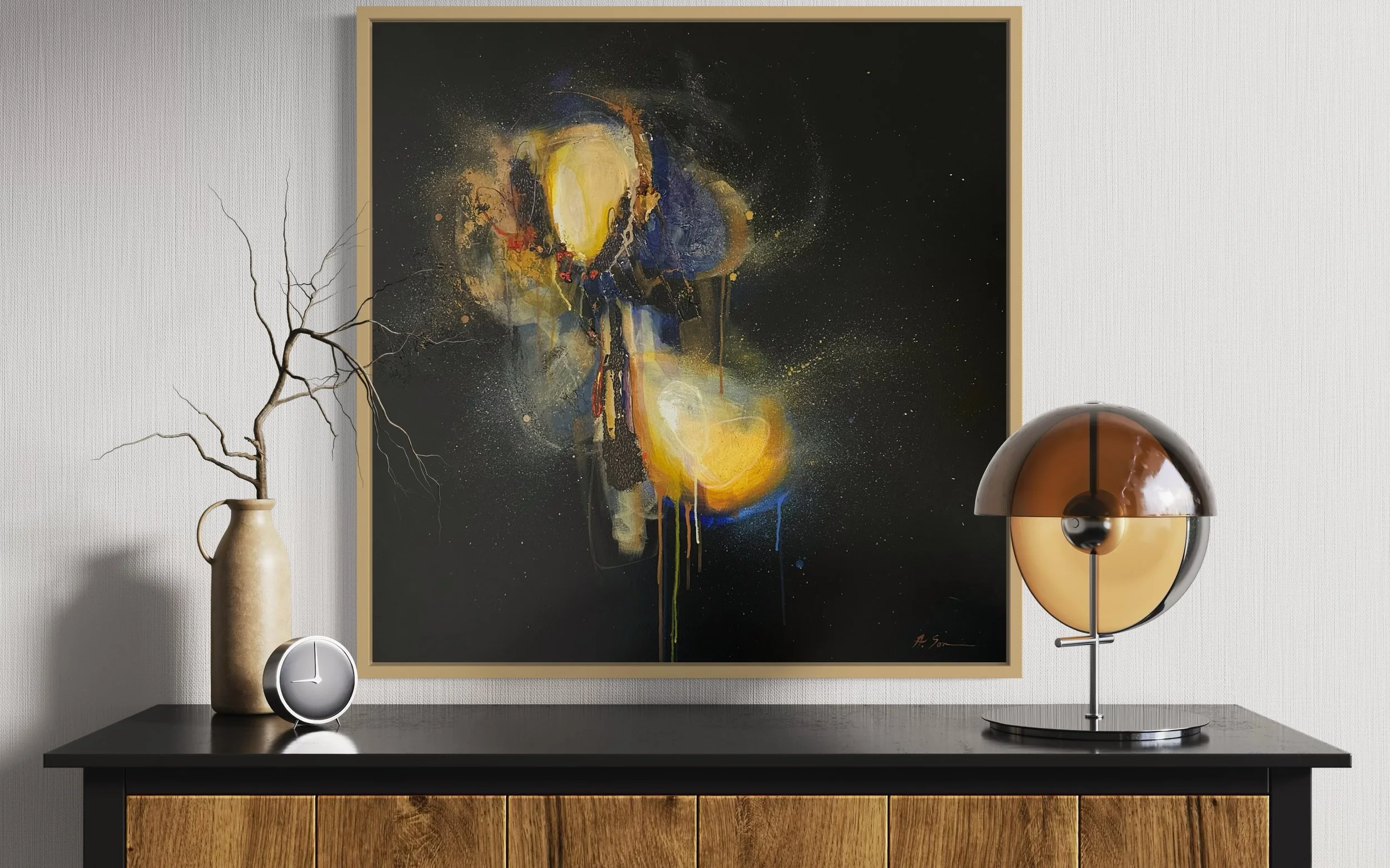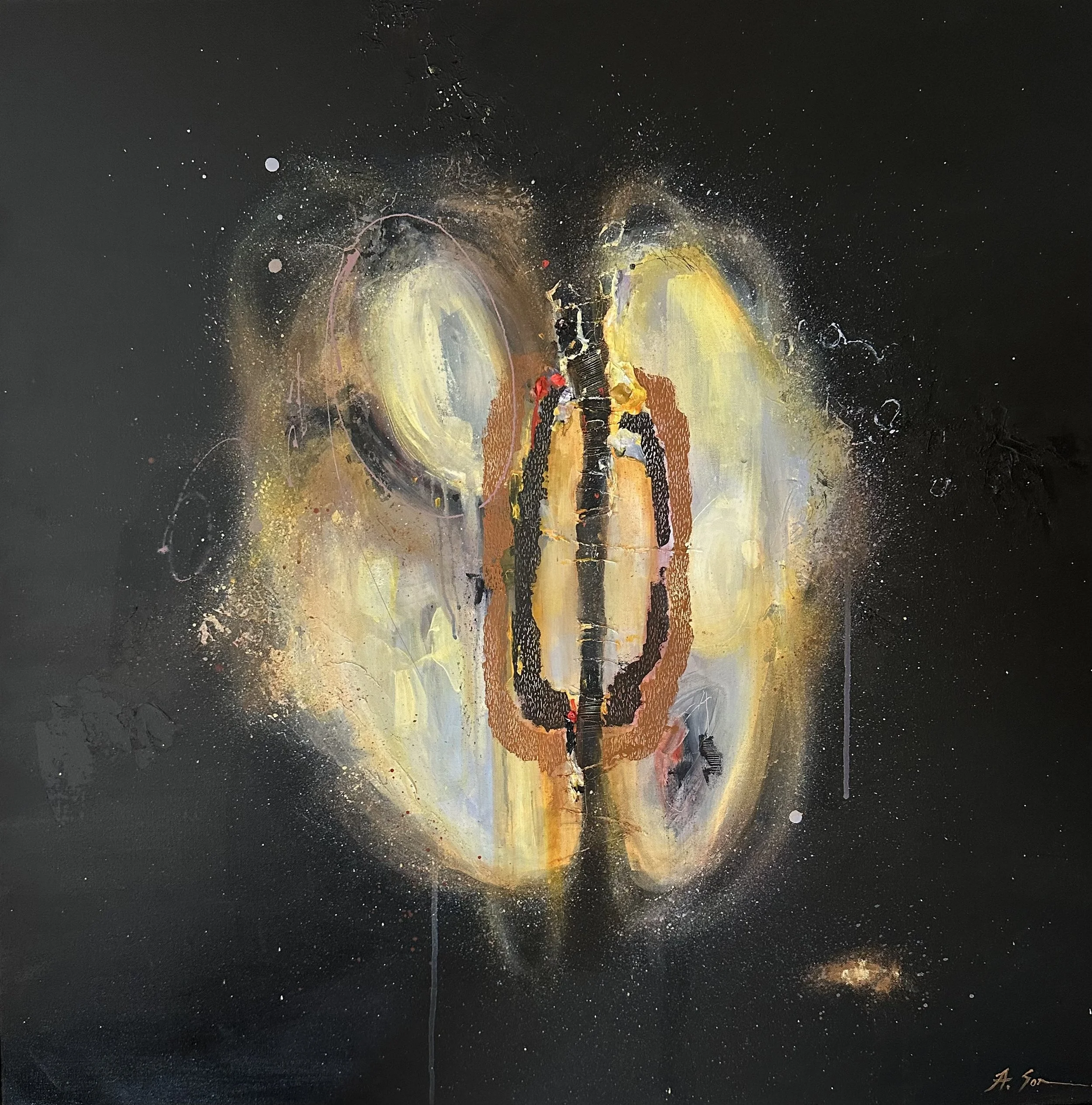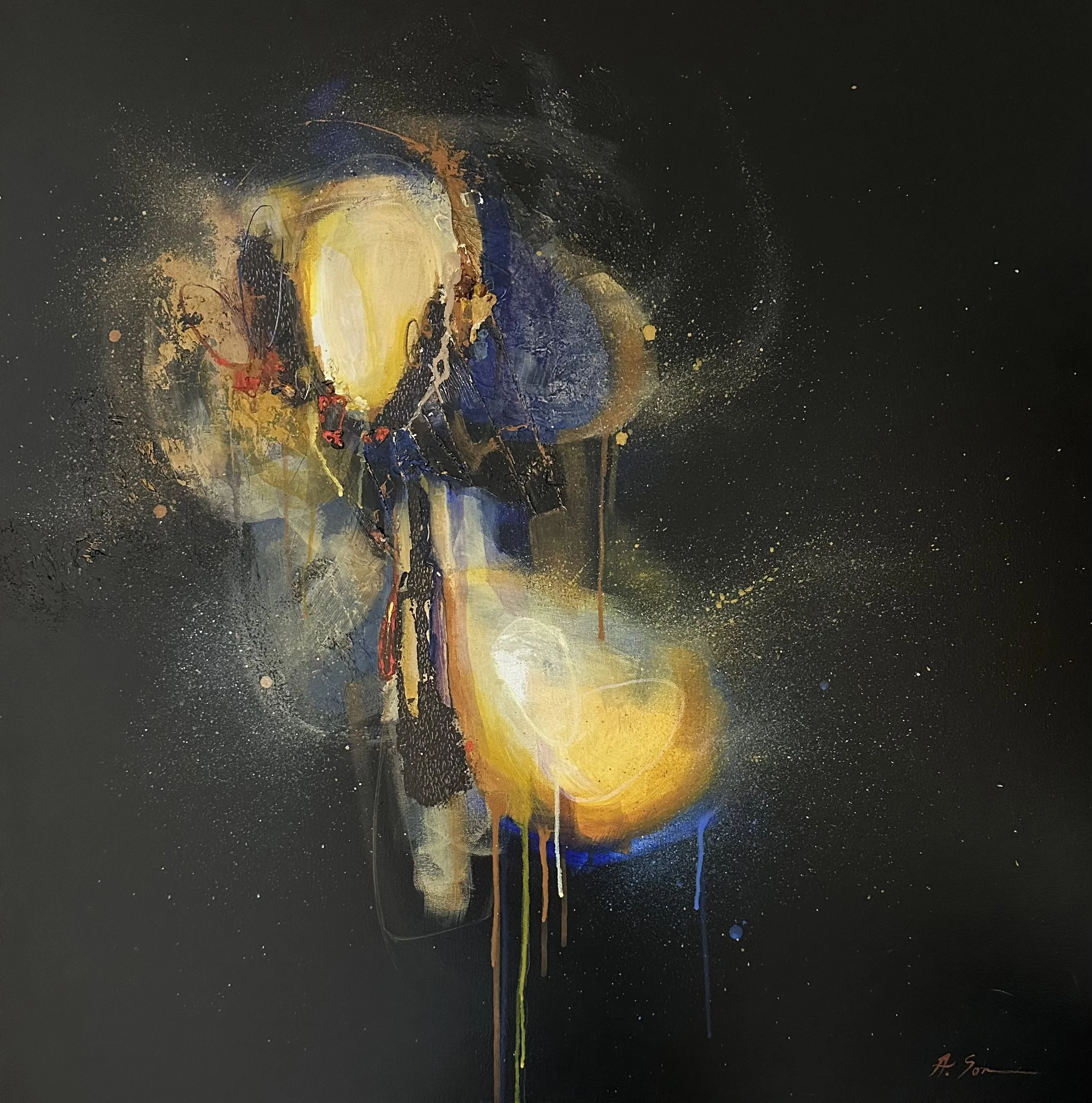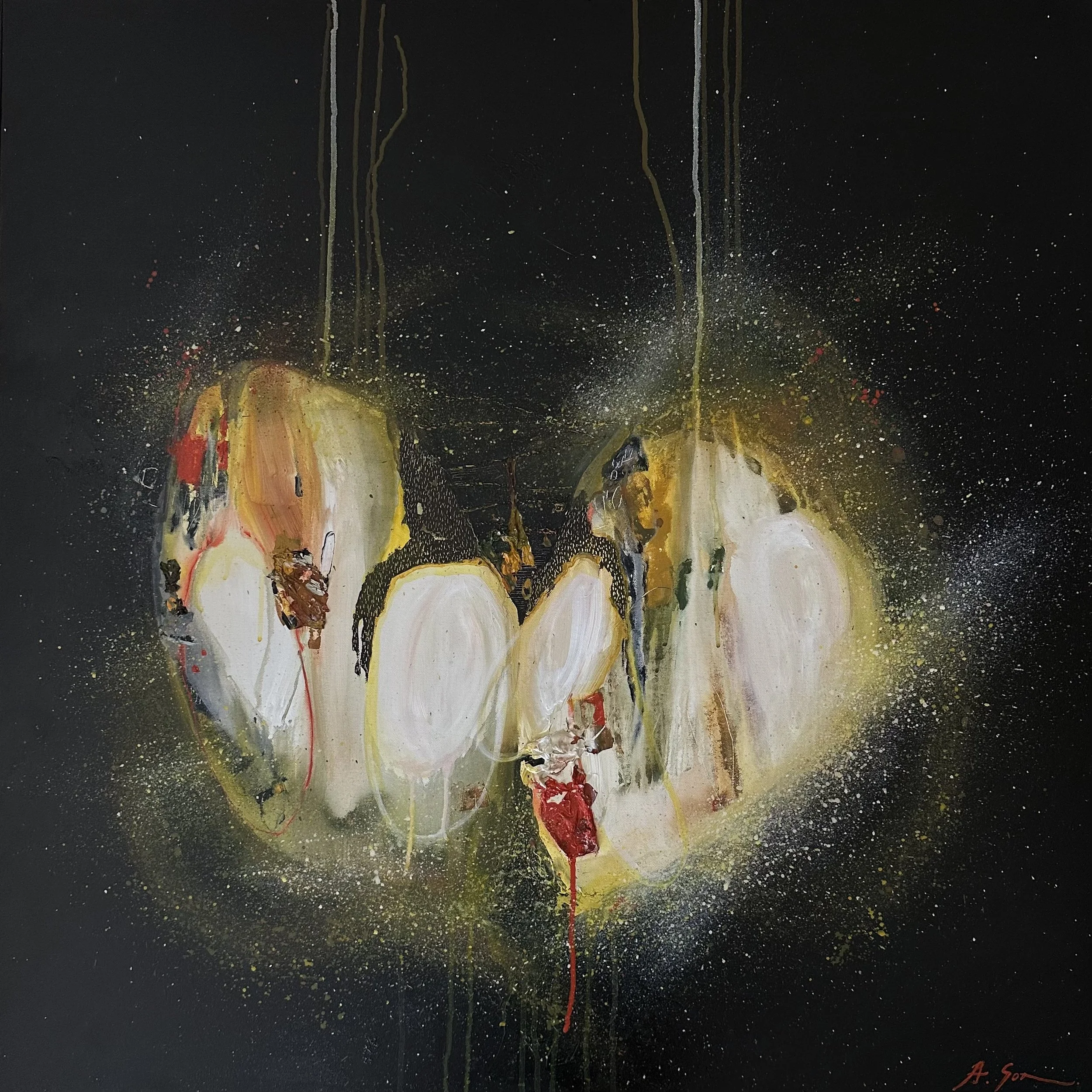 This body of work aims to capture the ethereal pull between souls. I have juxtaposed immersive color and abstract lines with the dispersion of hues to emanate energetic intrigue. The use of a texturing medium pronounces connectivity. The dark base anchors the light in order to give an essence of expansiveness and void in congruence to the vibration of colors. This is to signify how we are nothing and everything at once.