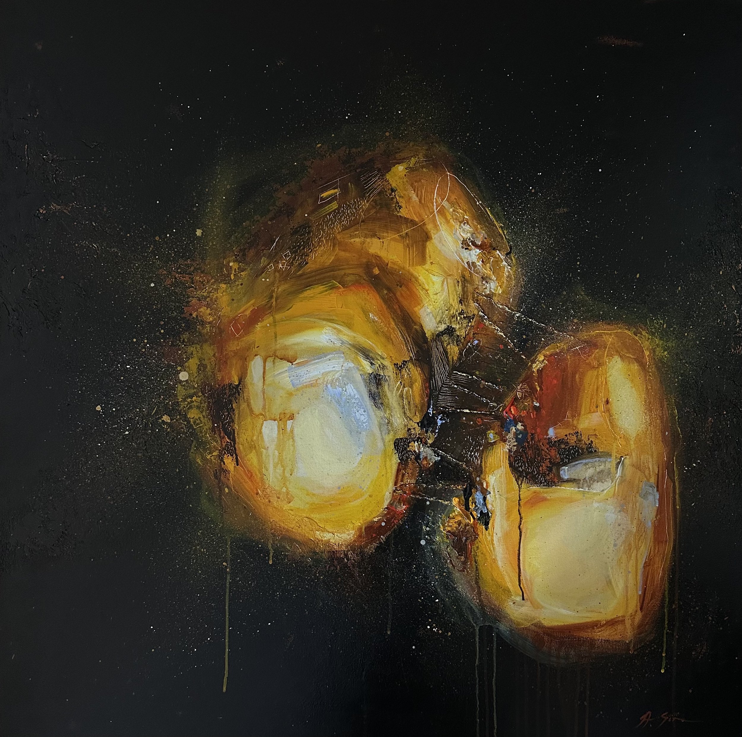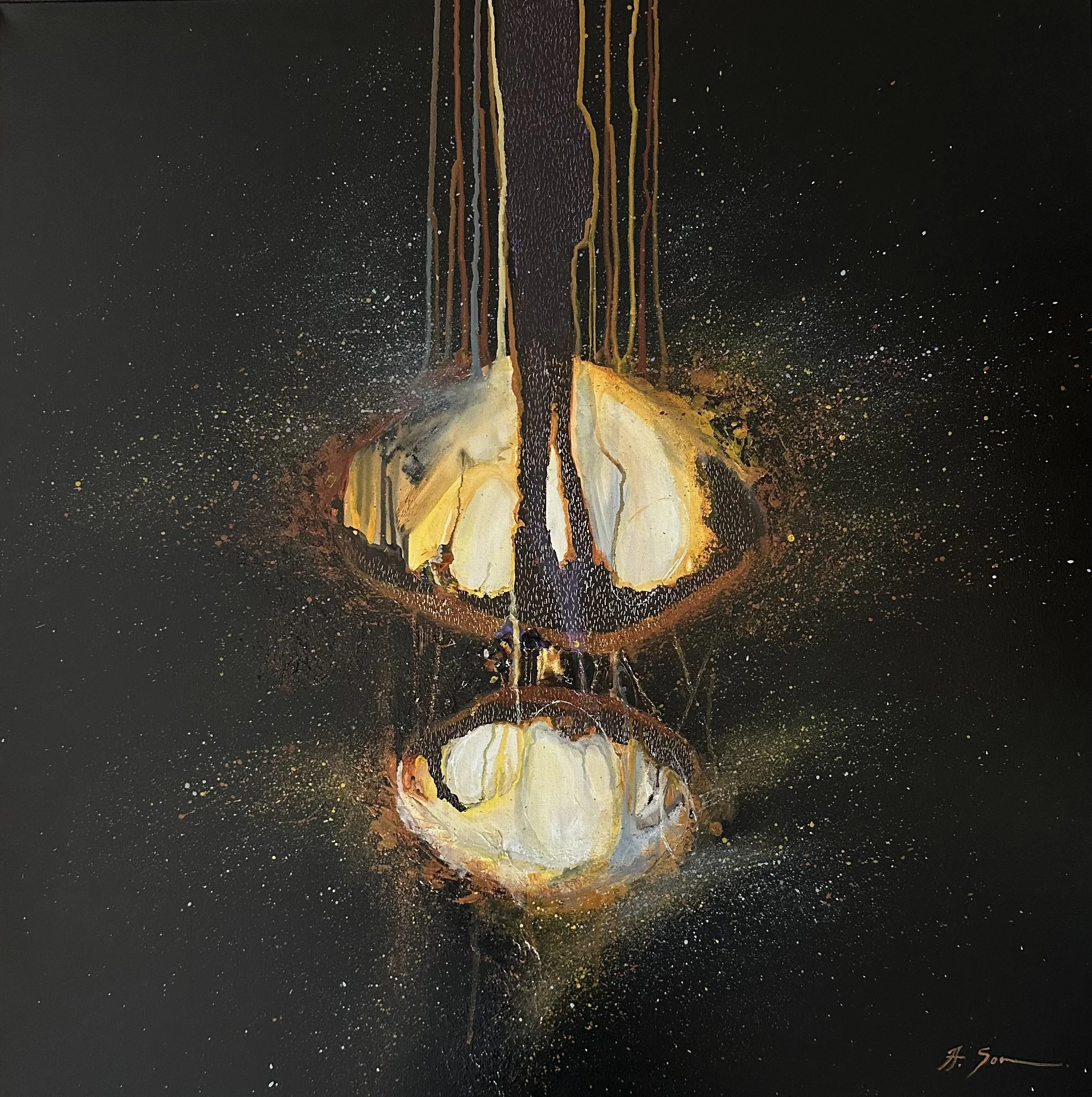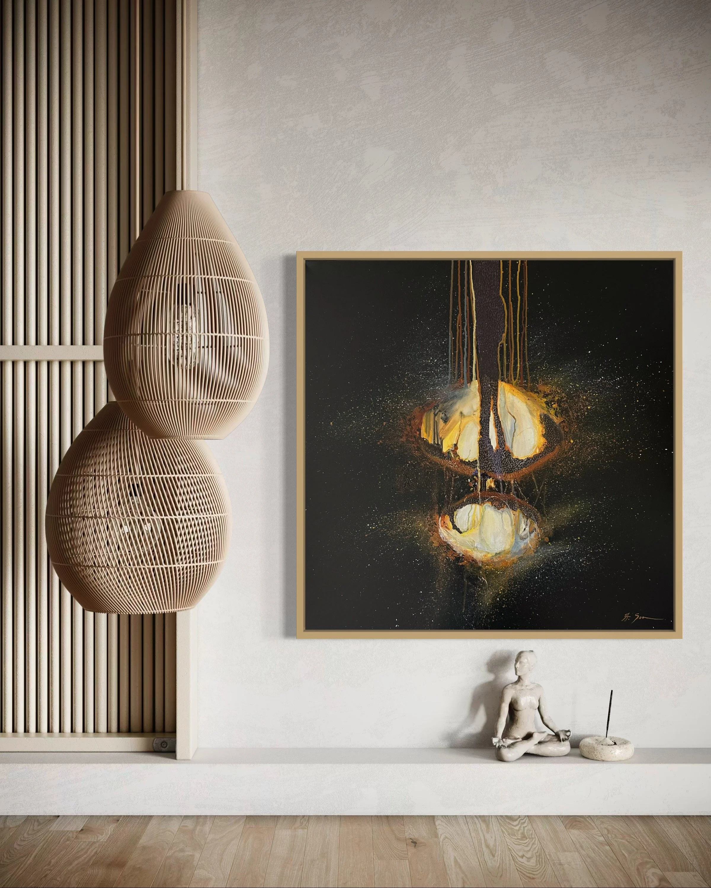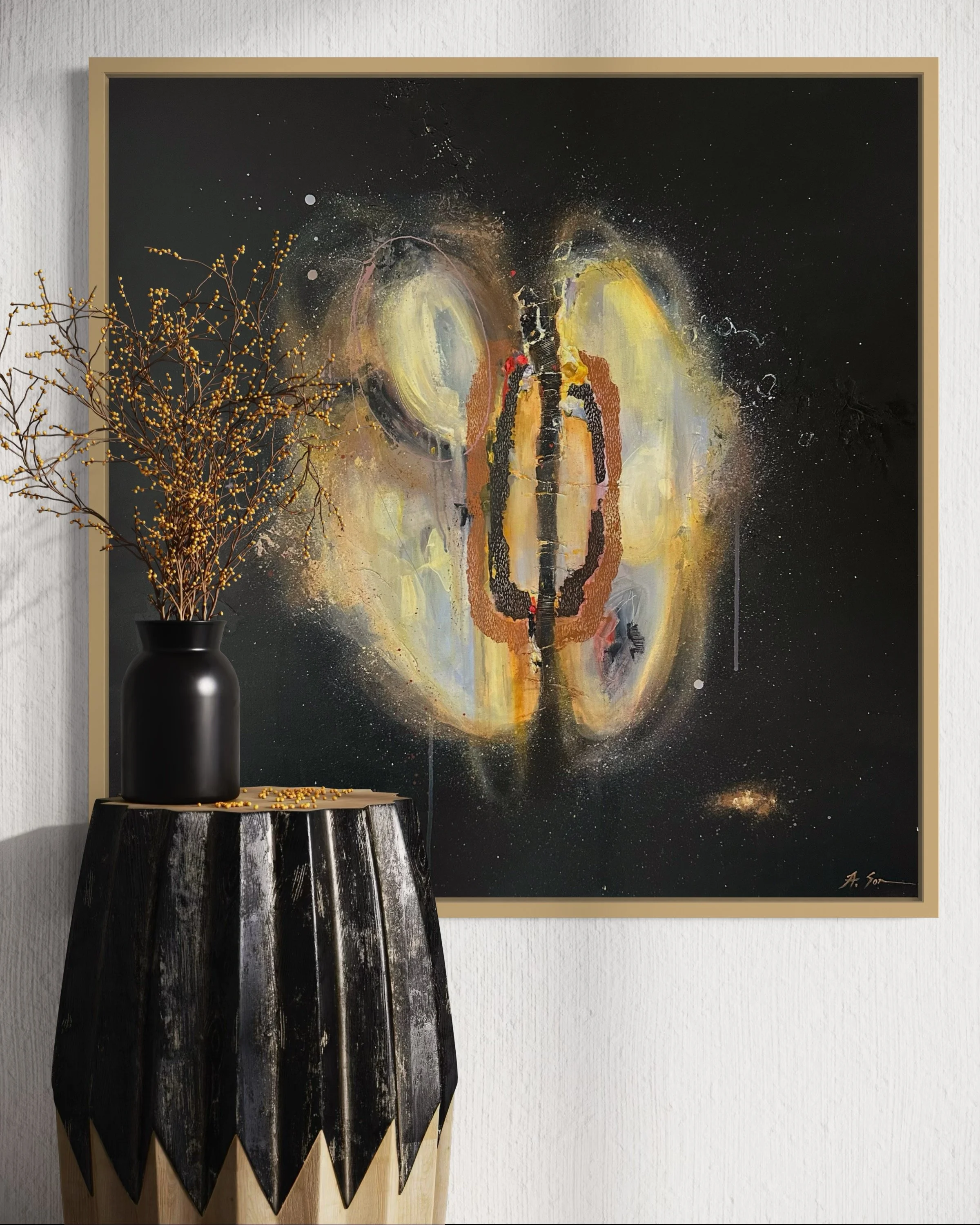 This body of work aims to capture the ethereal pull between souls. I have juxtaposed immersive color and abstract lines with the dispersion of hues to emanate energetic intrigue. The use of a texturing medium pronounces connectivity. The dark base anchors the light in order to give an essence of expansiveness and void in congruence to the vibration of colors. This is to signify how we are nothing and everything at once.