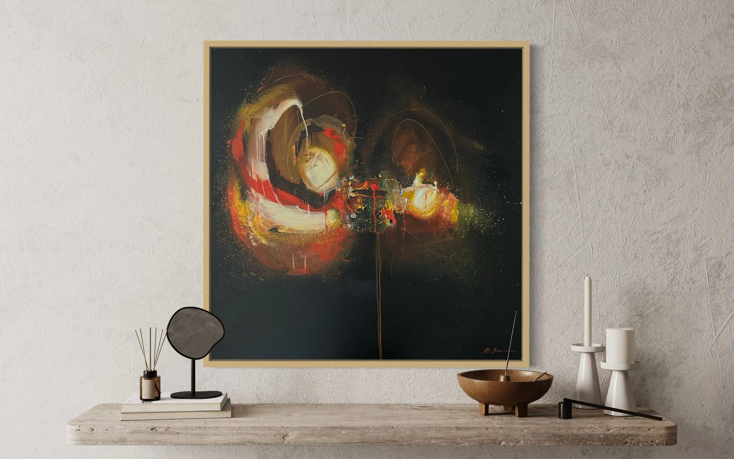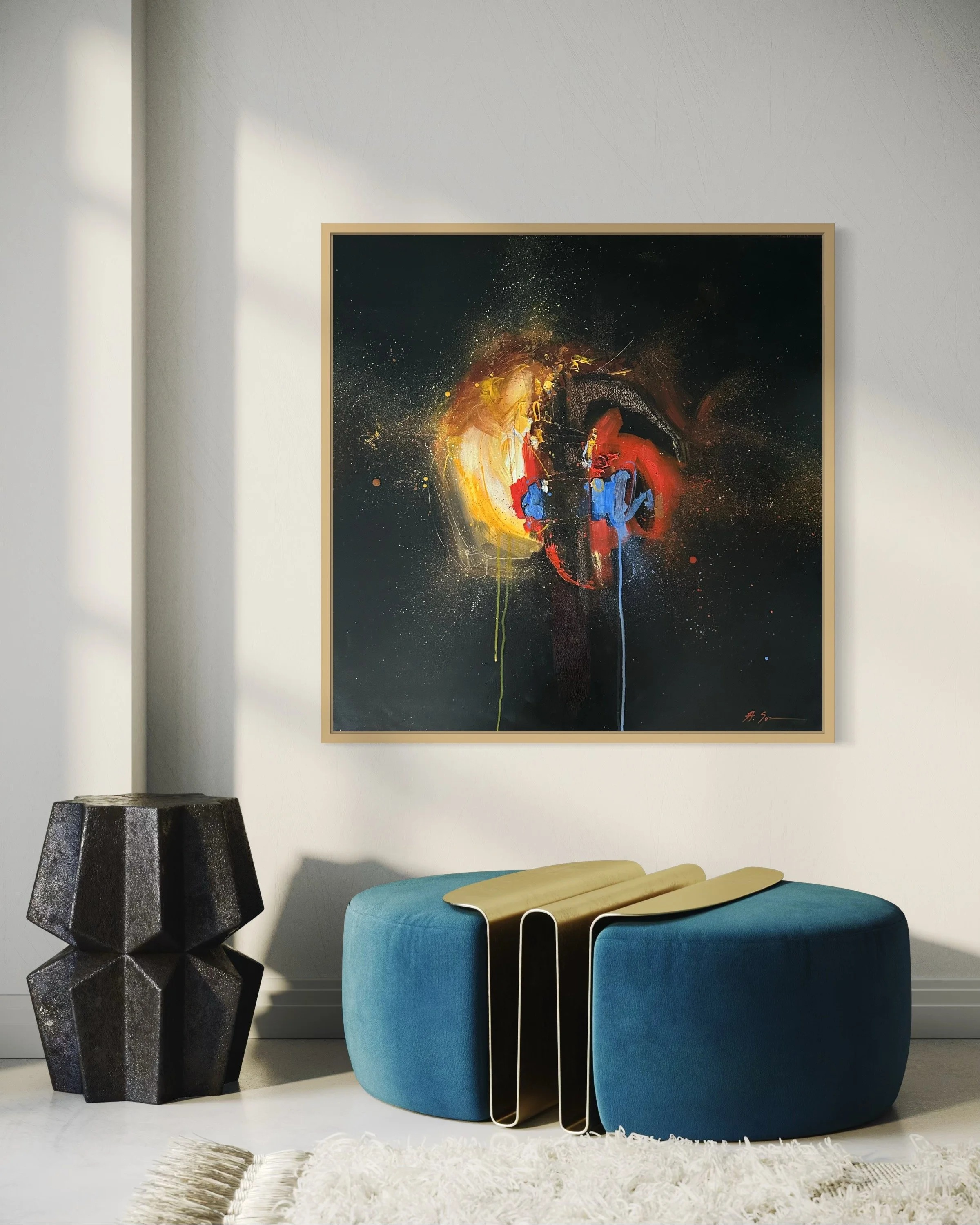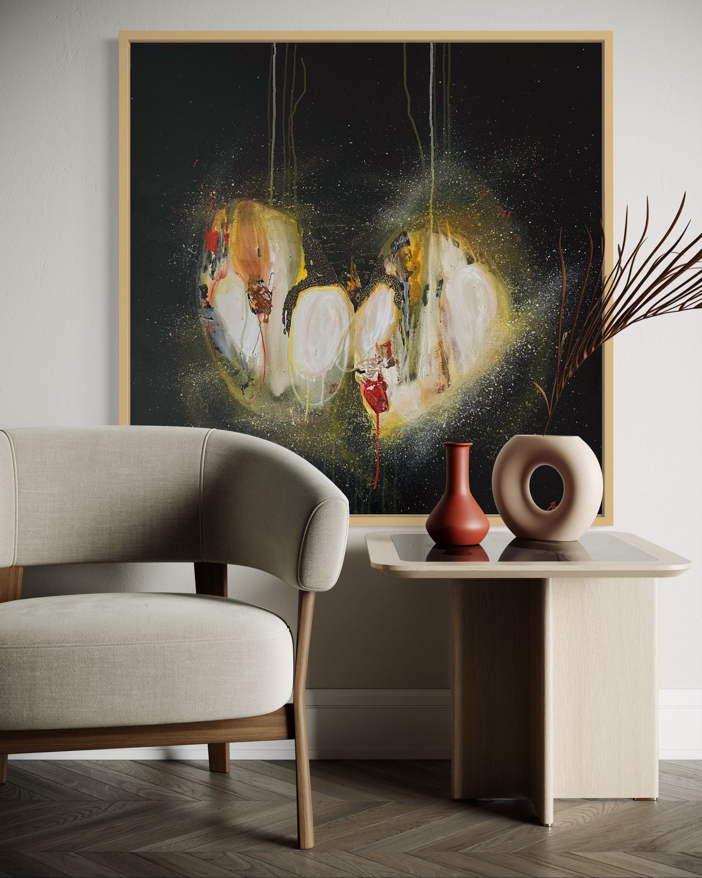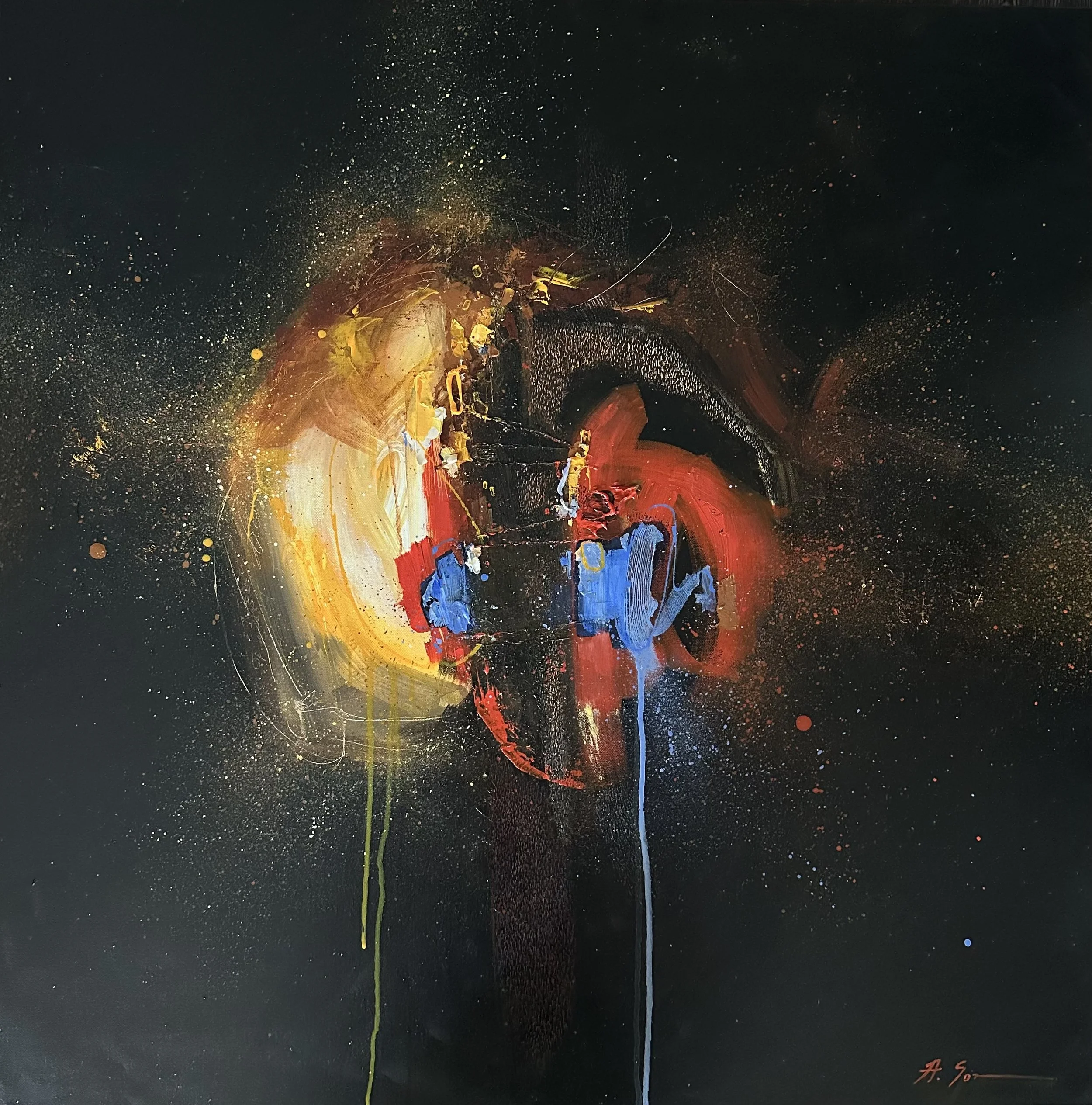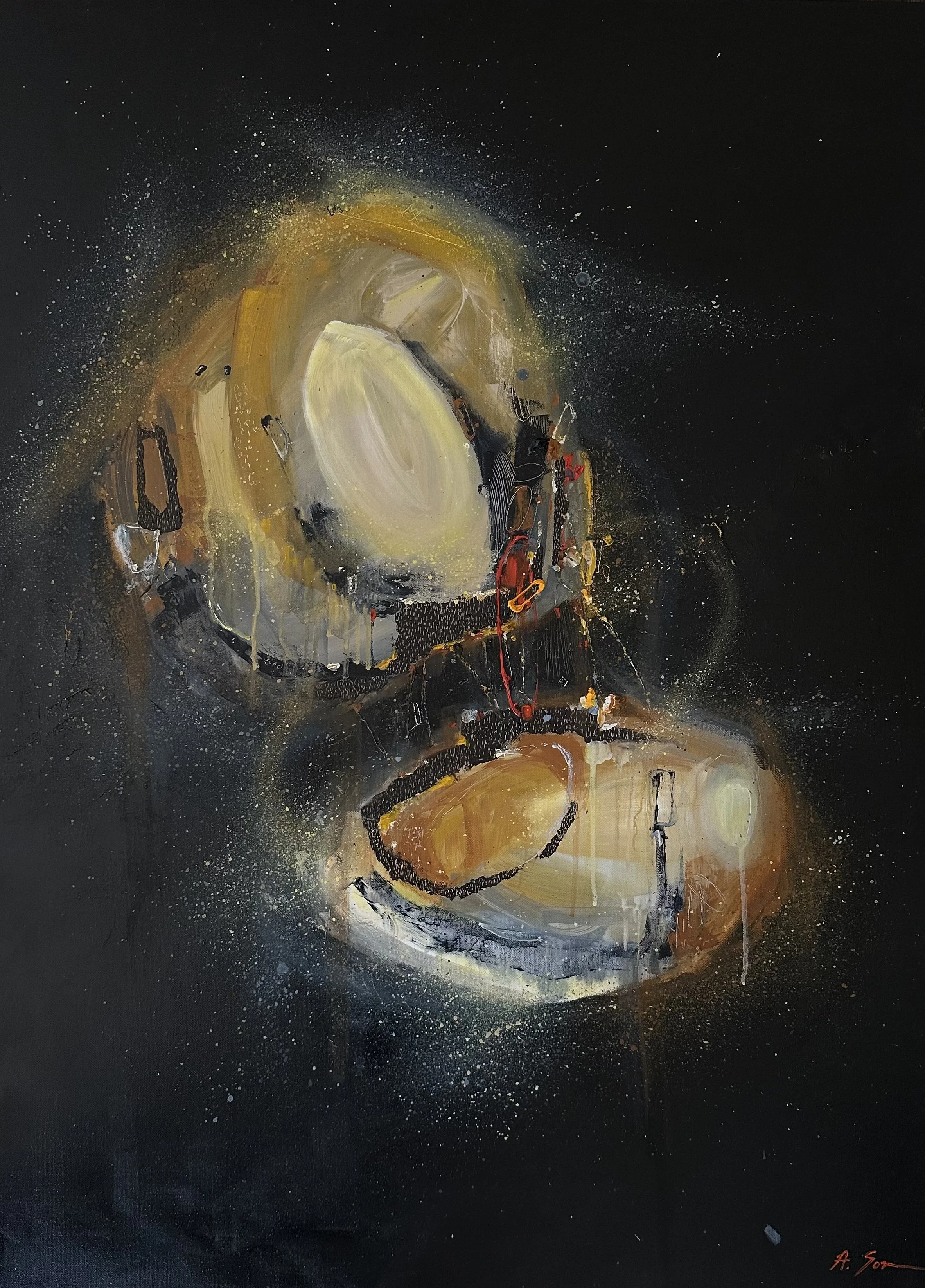This body of work aims to capture the ethereal pull between souls. I have juxtaposed immersive color and abstract lines with the dispersion of hues to emanate energetic intrigue. The use of a texturing medium pronounces connectivity. The dark base anchors the light in order to give an essence of expansiveness and void in congruence to the vibration of colors. This is to signify how we are nothing and everything at once.
