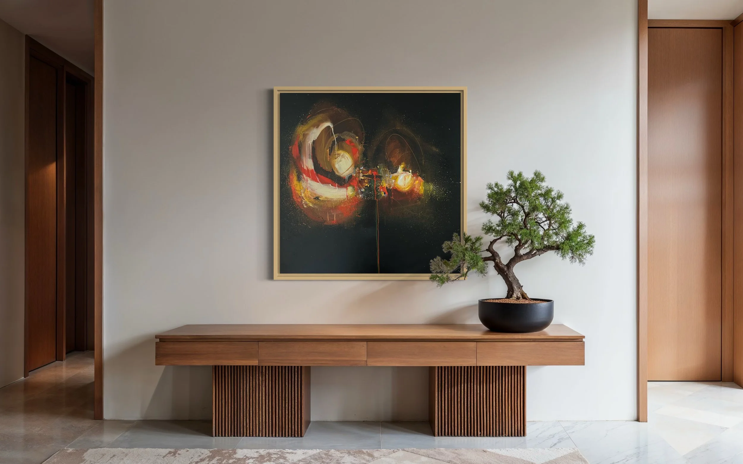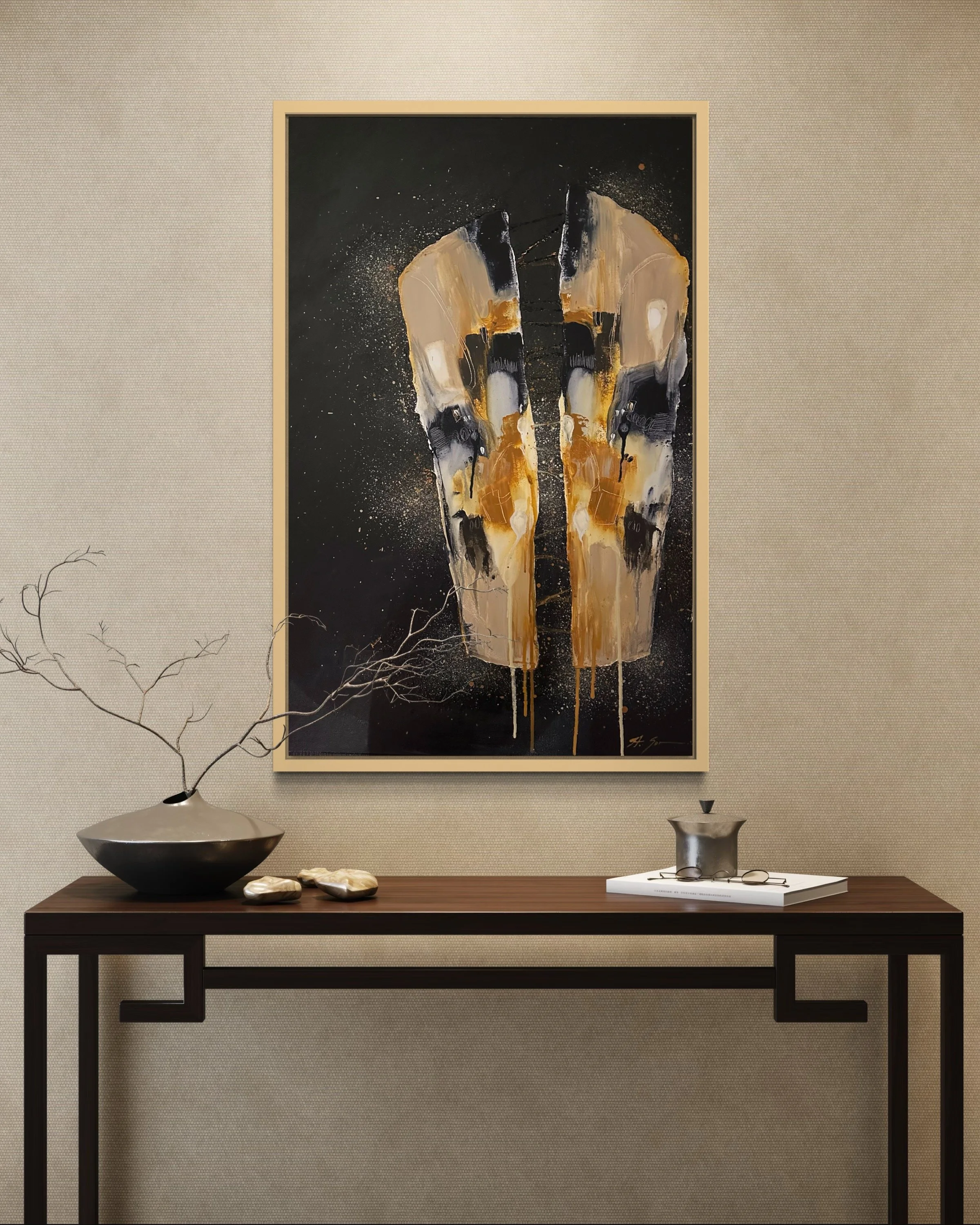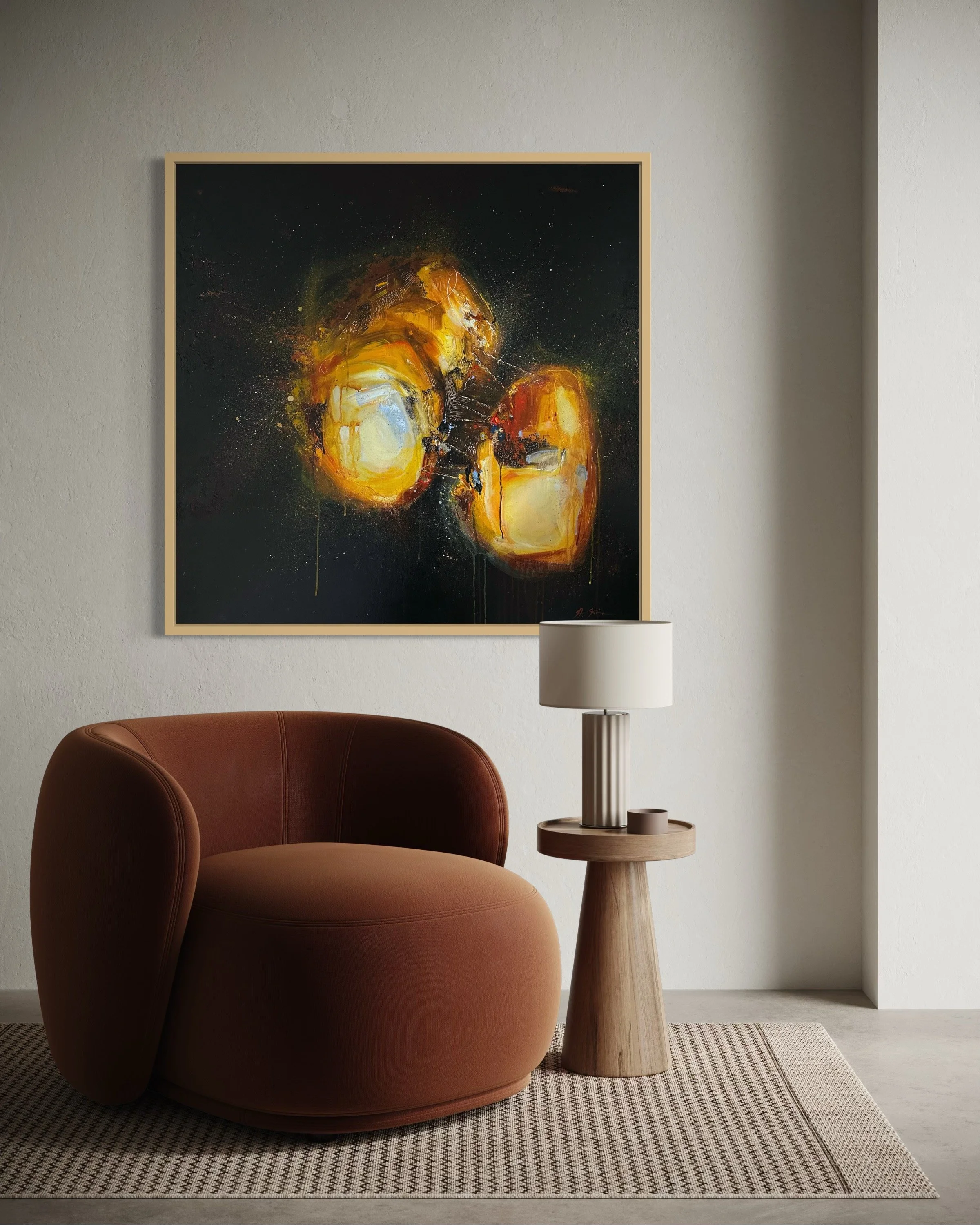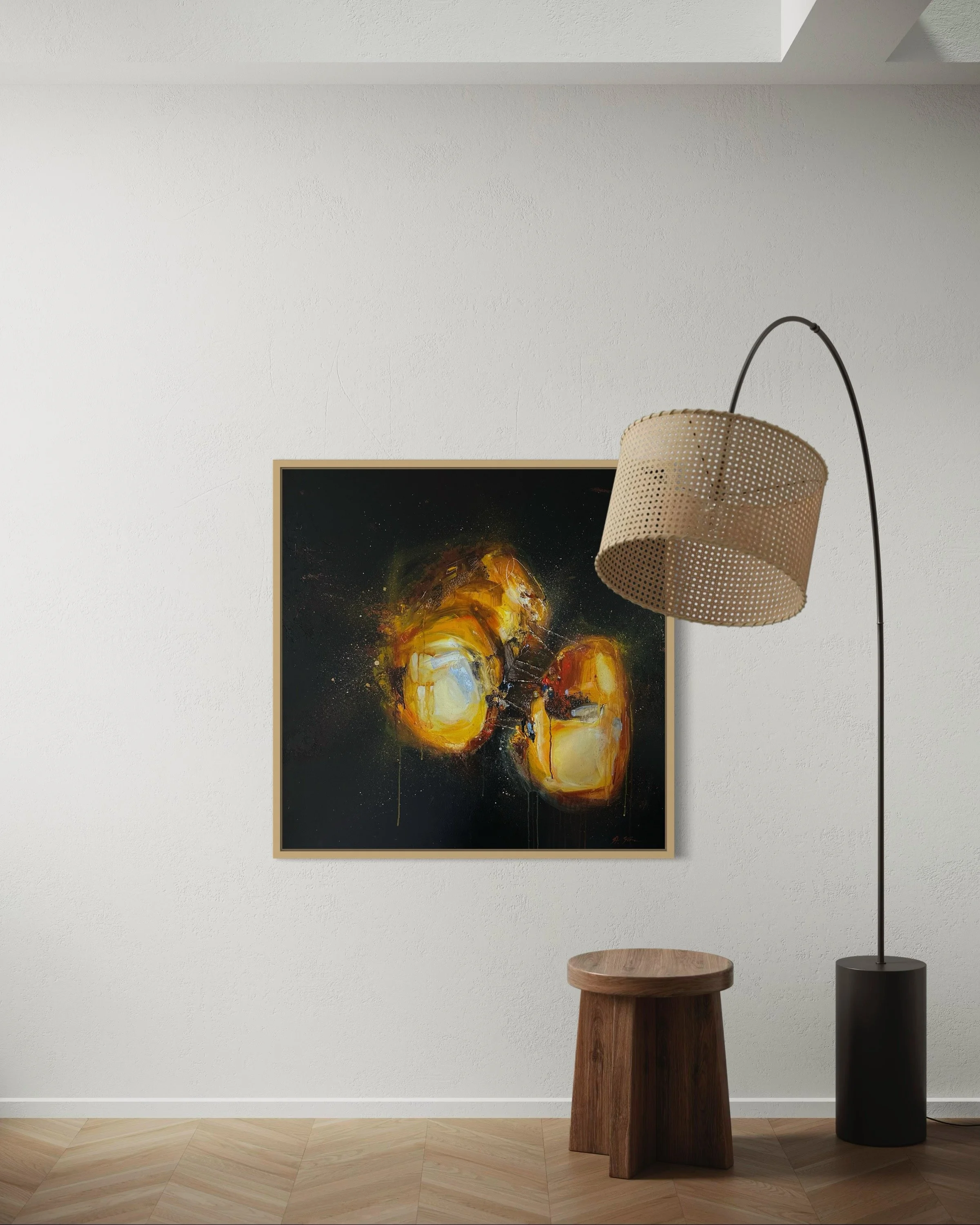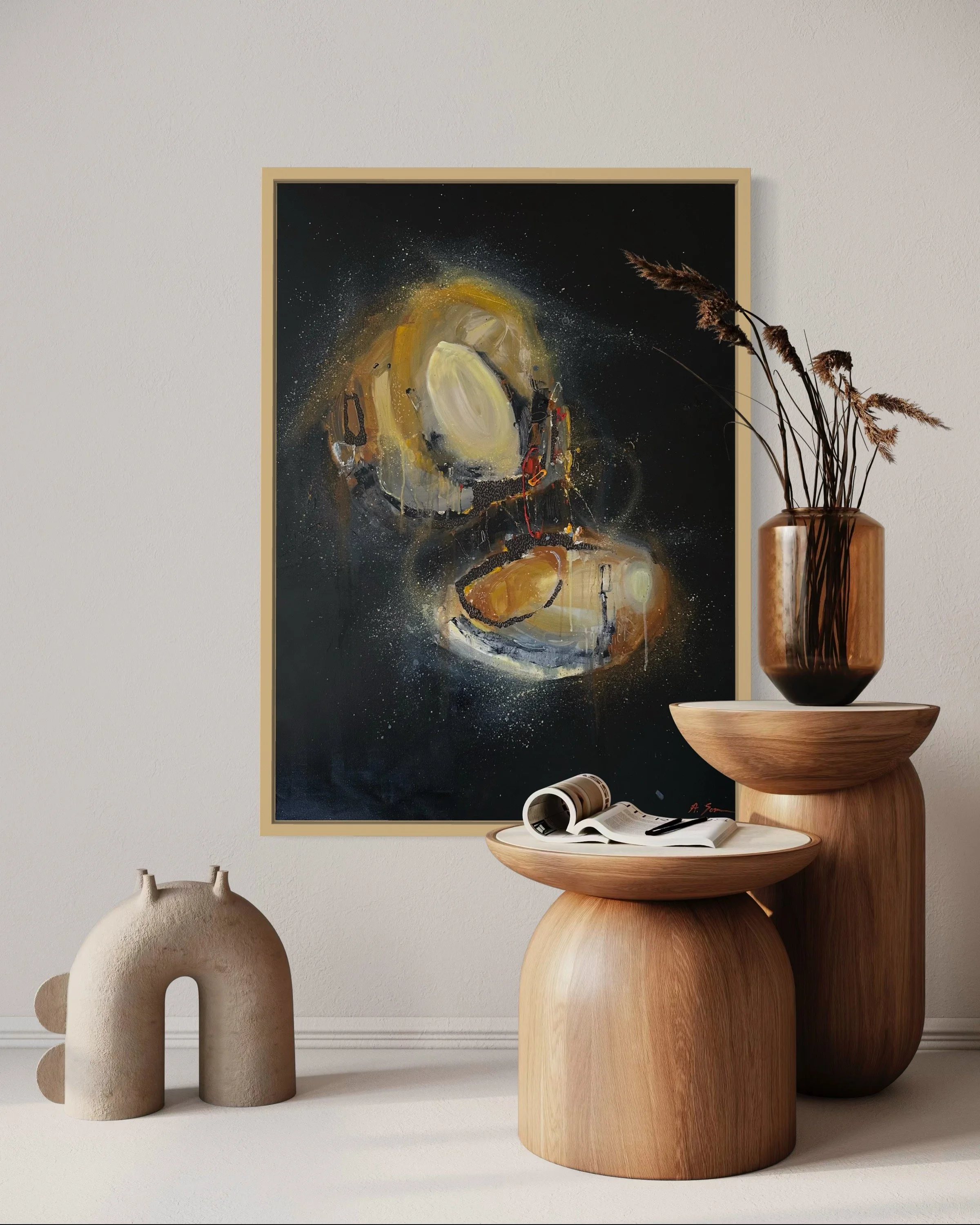This body of work aims to capture the ethereal pull between souls. I have juxtaposed immersive color and abstract lines with the dispersion of hues to emanate energetic intrigue. The use of a texturing medium pronounces connectivity. The dark base anchors the light in order to give an essence of expansiveness and void in congruence to the vibration of colors. This is to signify how we are nothing and everything at once.